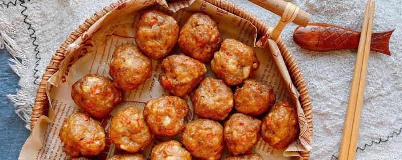 丸子复炸2分钟左右。丸子复炸一遍可以使其外焦里嫩,口感更加丰富。注意丸子的初炸和复炸要间隔10分钟左右,全程要用中小火,避免将丸子表面炸焦,影响丸子的味道以及美观度。