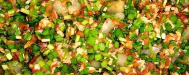 9、最后将洗好的韭菜切段,倒入馅料中,直至完全搅拌均匀后再顺着一个方向继续搅拌即可。