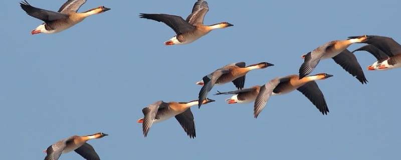 大雁的胸骨上有高耸的突起部分叫做龙骨突,龙骨突的两侧有发达的肌肉胸肌,胸肌发达收缩有力,飞行时能产生强大的动力,利于牵动两翼完成飞行动作。大雁的体形相较其他鸟类更大,且鸟喙的基部相较其他鸟类更高,其长度和头部的长度基本相等。
