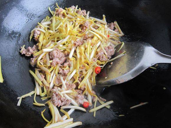 5、热锅凉油加肉馅、姜末,炒出香味。