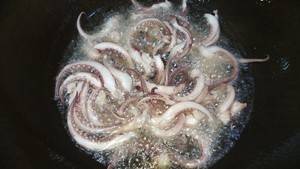 4、起锅烧油,先将炸鱿鱼须炸1分钟左右。