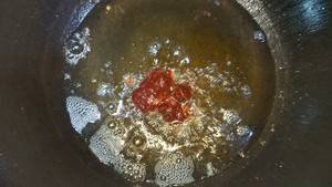 5、捞出鱿鱼后不用换油,直接下郫县豆瓣炒香。