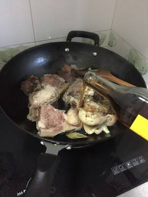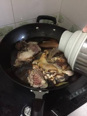 3、加入焯好水的牛脸,加入料酒、老抽、生抽。