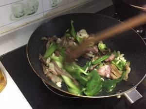 8、热油放辣椒、蒜爆香后放入牛脸肉和辣椒,炒至辣椒断生,加生抽即可。