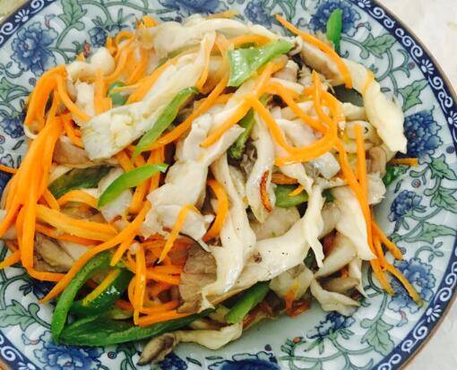 胡萝卜1个、青椒1个、平菇500g。1、平菇手撕成条,开水烫一下,青椒、胡萝卜切丝备用。2、倒油,先炒青椒和胡萝卜丝,然后放平菇,翻炒,倒鸡精、盐炒匀。3、即可出锅装盘。