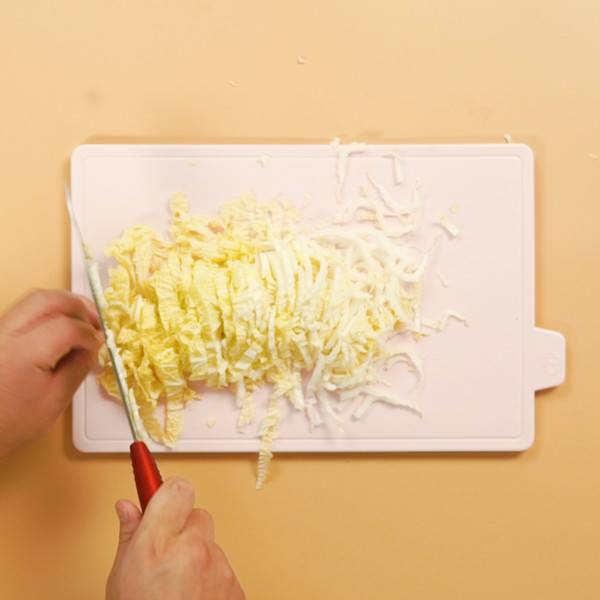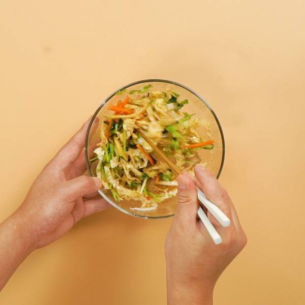 2、香菜切丝,大蒜切末,白菜切丝,胡萝卜切丝,黄瓜切丝。