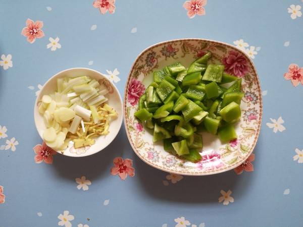 2、青椒切块,葱切葱段,姜切丝,蒜切片。