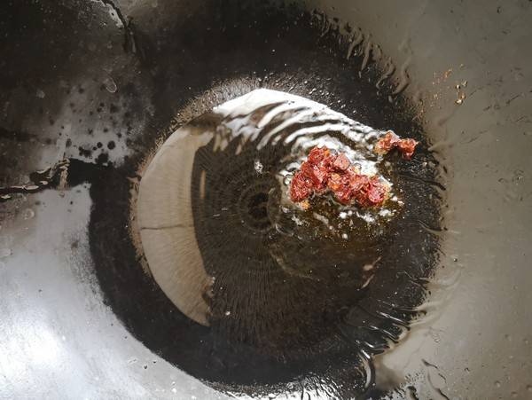 4、炒锅中加食用油,放入郫县豆瓣酱炒出红油。