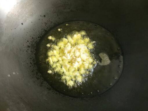 3、锅中倒入油烧五成热,加入蒜末爆出蒜香味。