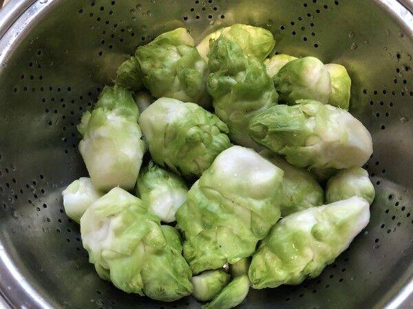 2、用手一个一个把小的儿菜头掰下,洗净。