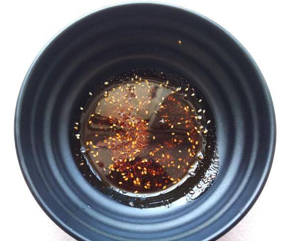 4、取一只大碗,调入辣椒油、香油、花椒粉、陈醋、生抽、盐、糖待用。