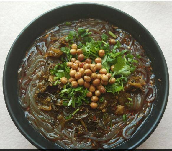 7、撒上老坛酸菜碎、香菜碎和酥黄豆拌匀即可。