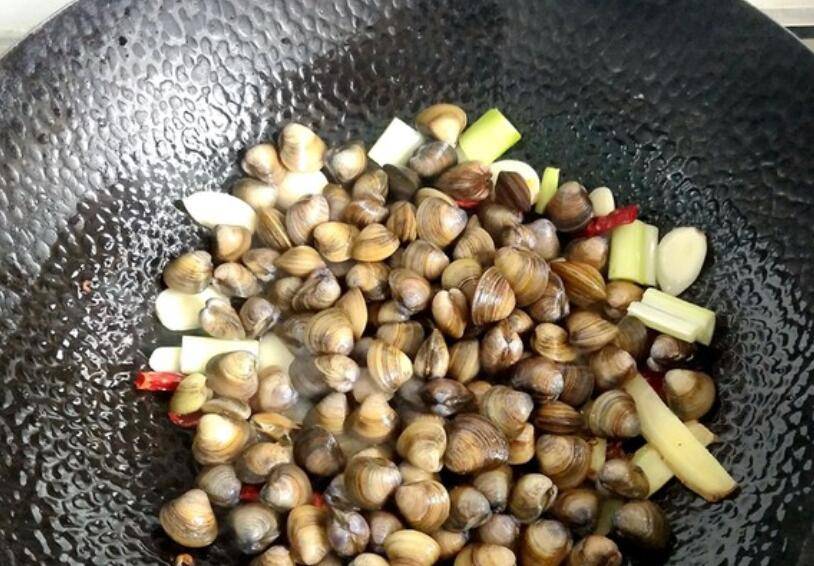 4、炒至沙蚬开口后,放盐调味即可出锅。