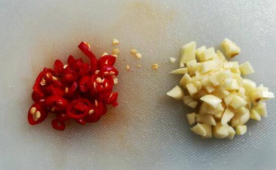 3、蒜米和辣椒切碎。