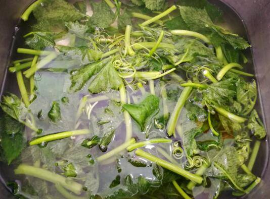 1、南瓜苗叶子沿着顶端,把表面的绒毛慢慢的撕掉,掐成合适入口的长度。