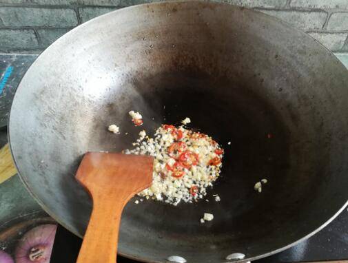 4、烧热油锅,放入蒜米和辣椒爆香。