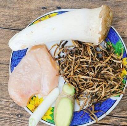 用料:金针菜适量、杏鲍菇适量、葱1根、姜3片、生抽2勺、蚝油1勺、糖1勺、盐半茶匙、鸡胸肉适量。