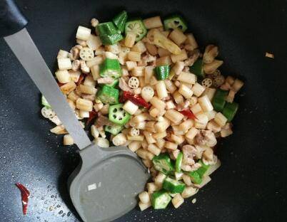 下入秋葵和瘦肉翻炒至熟,调味即可。