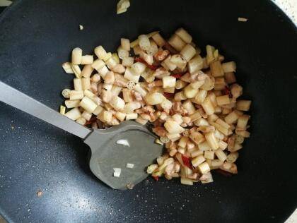 下入藕带翻炒,加盐和鸡粉调下味。