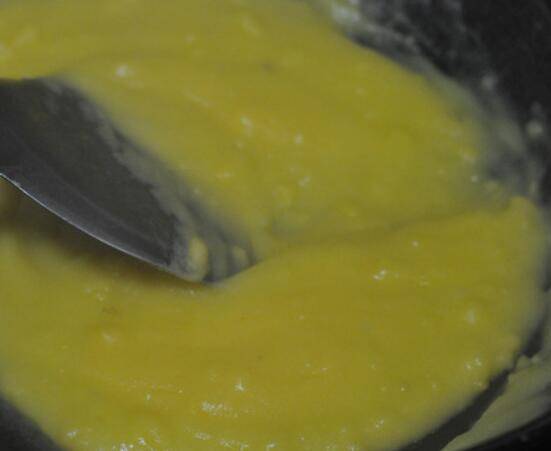 6.锅里倒入250克水,烧开后将玉米面糊倒入,左手倒,右手搅,用锅铲不停地搅,以防有疙瘩。