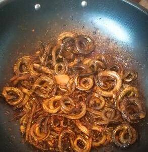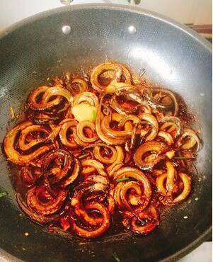 加入盘鳝,进行干煸 ,加入盐,适量生抽,老抽,鸡精。干煸时间在半小时左右,根据个人喜好,选择起锅时间即可。