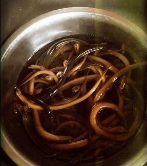 开水烫死盘鳝,洗净,晾干。