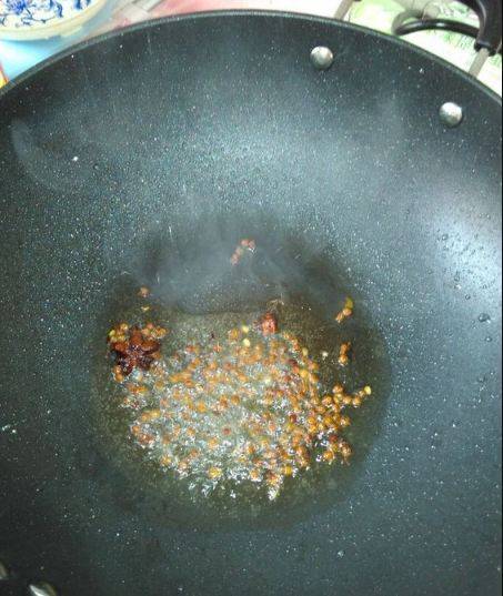 4、热锅下油,把洗干净的花椒放下去爆香后捞起。