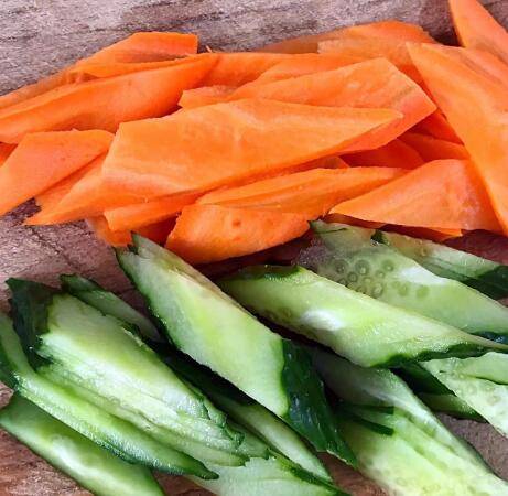 3、胡萝卜去皮黄瓜洗净切成马蹄片,葱蒜切好备用。