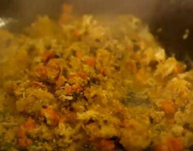 3、旺火热锅,锅中加少许色拉油、少许猪油,放入葱姜末煸香,倒入蟹粉翻炒。