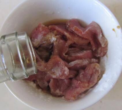 2、将鸭脯肉切薄片,鸭肉放碗里,用豆瓣酱、蚝油、食盐、料酒、蒜片拌均腌制15分钟。