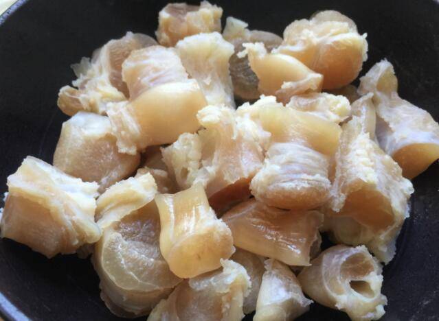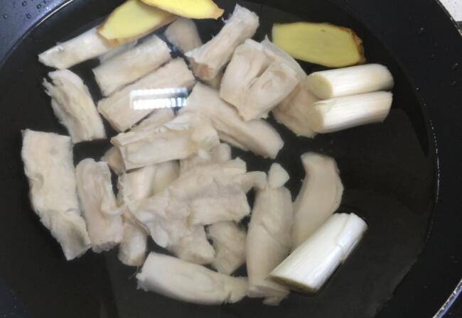 2、清水中放少许姜片,葱段和料酒,放进牛蹄筋煮开3分钟左右,去除牛蹄筋的腥味。这步一定要有,牛蹄筋的腥味是比较重的。