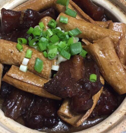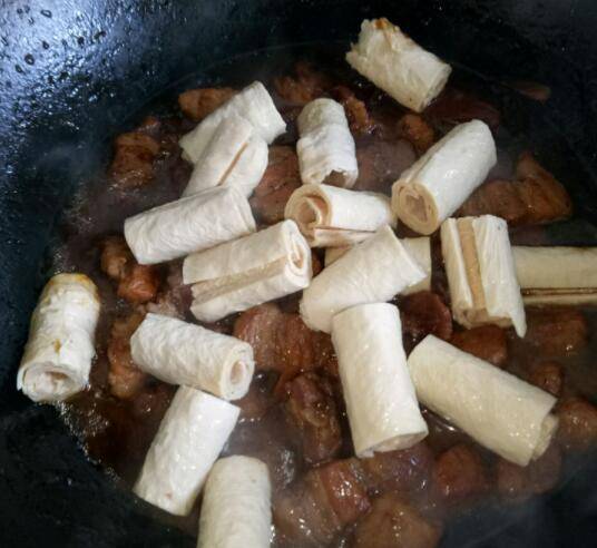7、牛蹄筋已经能够戳动的时候,放入豆棒,大火收汁即可。因为豆筋非常容易熟,所以放的时间不能太早,容易炖烂。
