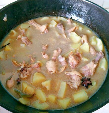 5、倒入老抽加水没过食材开大火烧煮后放人姜片和八角茴香。