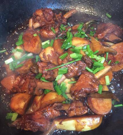 7、半小时后汁水收得差不多洒上葱花翻拌均匀。