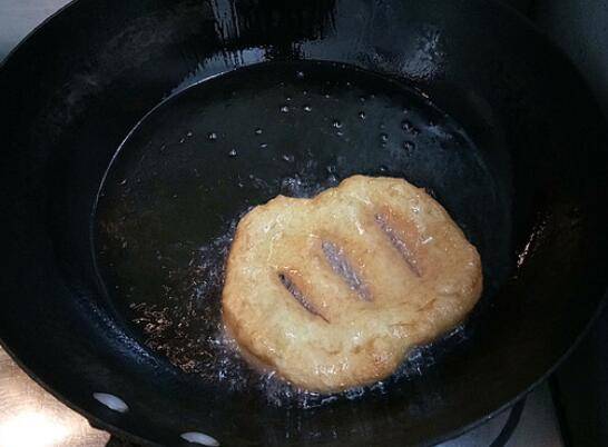 6、锅中加入食用油,油温六七成热放入油饼,中小火炸制两面金黄即可。