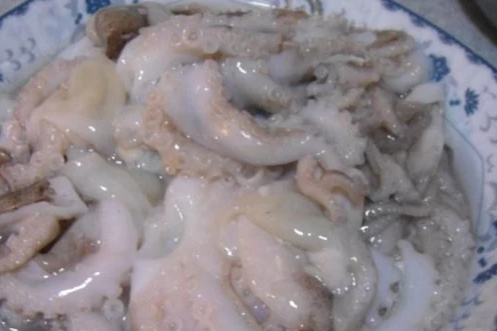 3、清洗八爪鱼。把八爪鱼的眼睛、牙齿、内脏等全部抠掉,清洗干净八爪鱼的墨汁。这个清洗过程相对久一些。