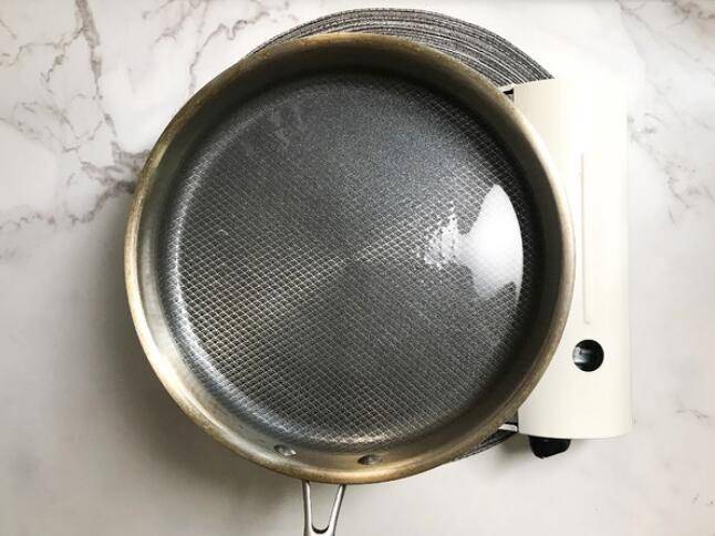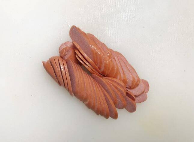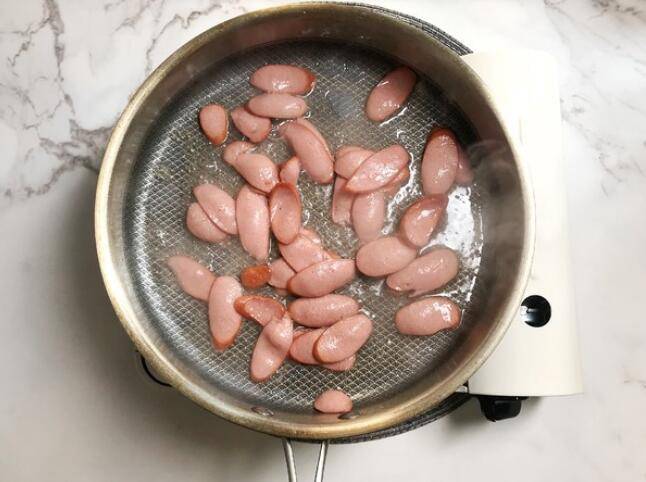 5、牛肉肠倒进锅内,将牛肉肠的水分炒干。