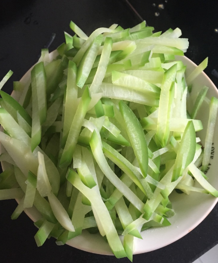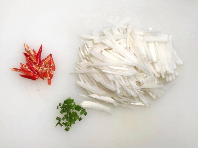 2、萝卜,辣椒洗净,切丝,大蒜叶切小段。