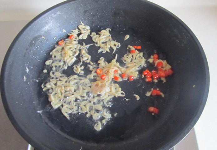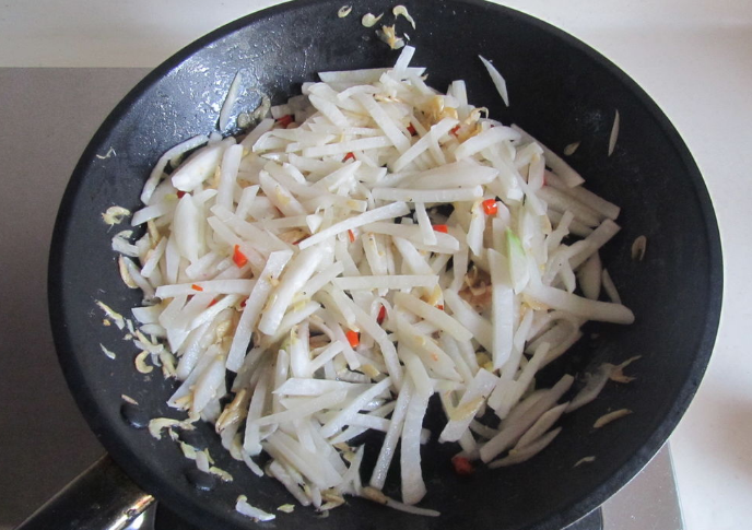 4、翻炒出香味后加入白萝卜丝进去翻炒。