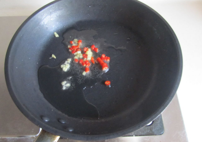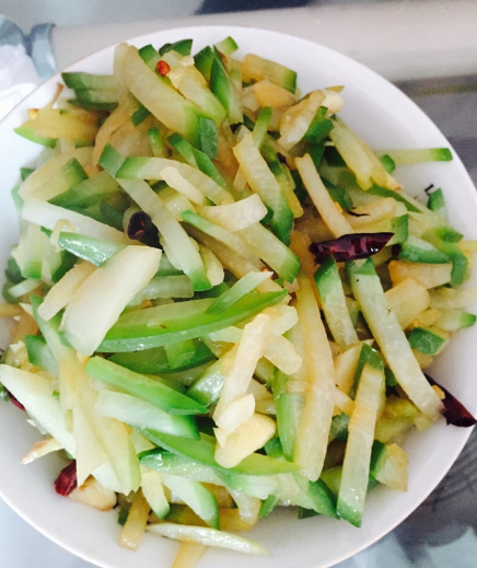 4、油锅热后放入辣椒葱姜蒜末,出香味后放入焯好的萝卜丝翻炒几下放盐,老抽,出锅。