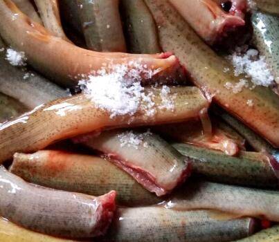 泥鳅去头和肚肠,洗净。将盐撒泥鳅上,抖动均匀。