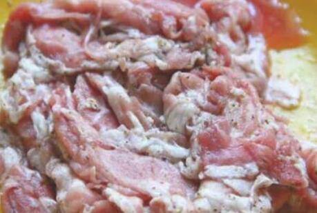 取200克羊羔肉片,室温解冻,用流动水冲去血水,加2毫升料酒,盐少许,花椒粉一小勺腌制。