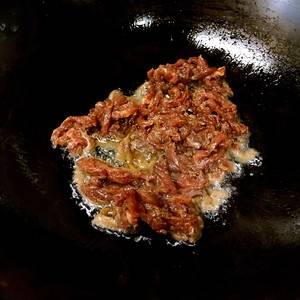 8、把肉铲开,开小火,约半分钟后,改中大火,开始翻炒。