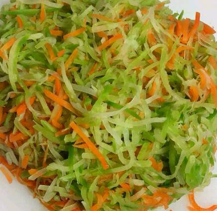 将青红萝卜切丝,开水下锅过一遍水断生,剁碎,备用。