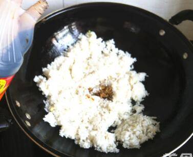 5、再加少许植物油,倒入米饭,炒散,淋入少许老抽调色,炒匀。
