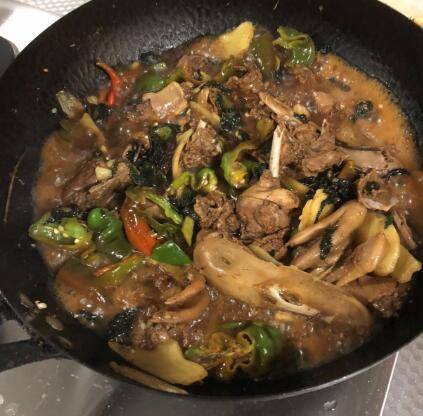 倒入鸭肉翻炒,加入青椒、紫苏。