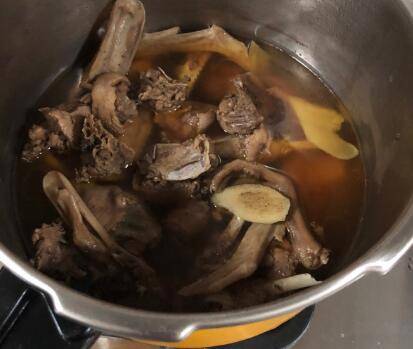 将炒干的鸭肉放入高压锅,加姜片,加水,没过鸭肉,压20分钟。