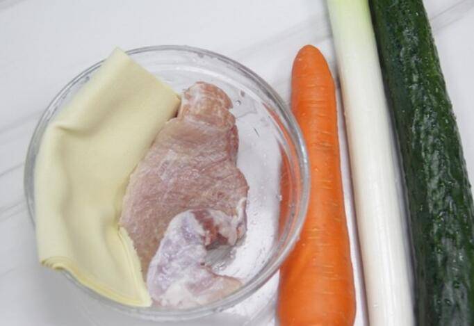 用料:瘦肉250克、大葱一根、胡萝卜半根、青瓜豆腐皮两张、盐适量、花生油适量、生抽5毫升、甜面酱10克、生粉5克、蚝油5克。