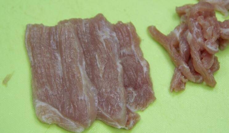 2.猪肉切成小条,顺着纹路切。