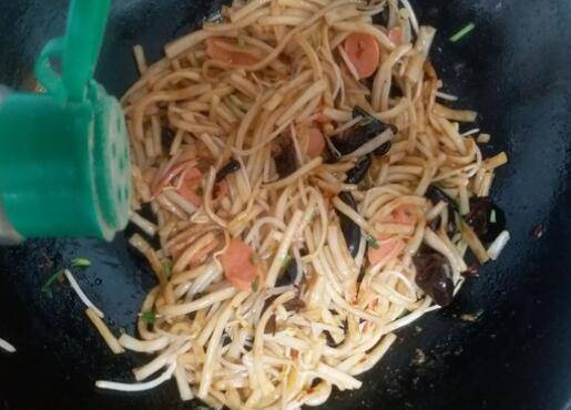 用料:米线50克、火腿肠一根、绿豆芽适量、黑木耳5克、葱花适量、辣酱一勺、老抽适量、生抽适量、盐适量、油适量、胡椒粉适量。